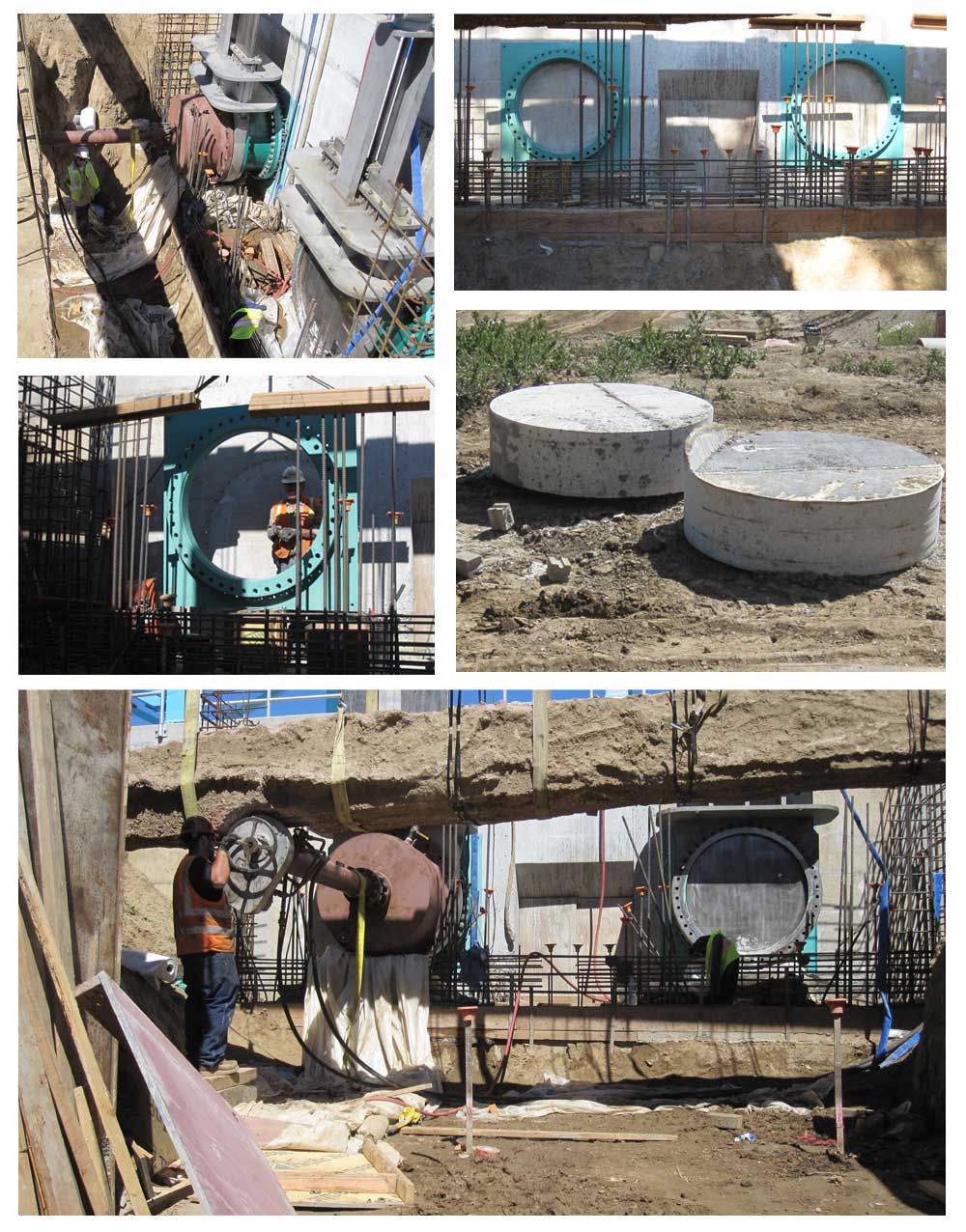 Wall tapping assemblies are used for hot tapping onto concrete walls, concrete storage tanks, and large diameter concrete conduits, where a backing draw plate is impractical. We manufacture any size contour to match your needs, with any size outlet through 120", in 125, 150, and 300 lb. classes. The body is fabricated from carbon steel and is available in shop coat or fusion epoxy coat, with either shop coated, fusion epoxy lined, or mortar lined waterways. The assembly is fabricated to match the existing wall contour. Our stainless steel anchor bolts are used to attach the tapping outlet securely to the wall. For smooth walls, one Q-Ring seal is adequate, though for extra security two Q-Rings seals can be used. All assemblies include stainless steel anchor bolts, and a carbide drill bit structure for drilling the concrete structure.